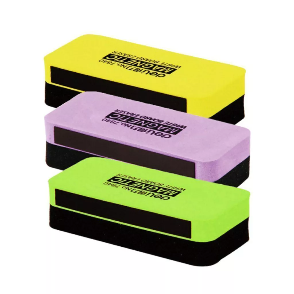 Borrador para pizarra Deli. Es magnetico, para que puedas dejarlo en tu pizarra sin problema. Apto para pizarra blanca y pizarra negra.
