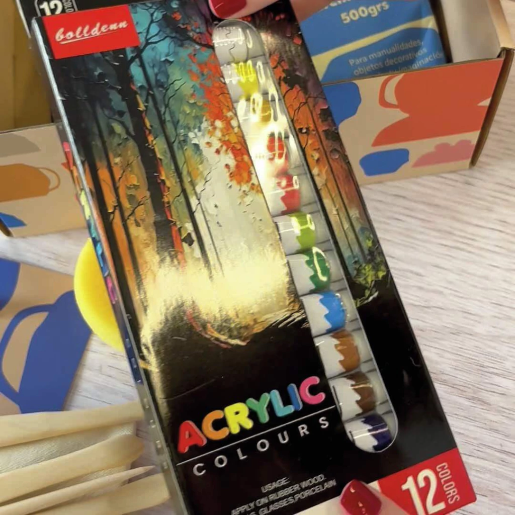 Para que tus creaciones tengan un acabado profesional, el set trae un barniz imprimante que sirve como base antes de pintar. Y para darle color a tus obras, encontrarás una caja con 12 pomos de acrílicos y 3 pinceles de distintos tamaños, ideales para lograr acabados brillantes y duraderos.